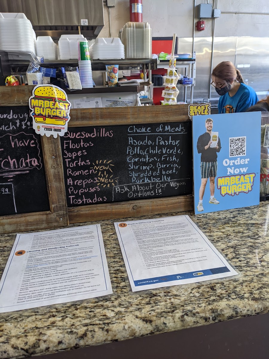 Pastrami, egg, cheese, beans, potato, and salsa.